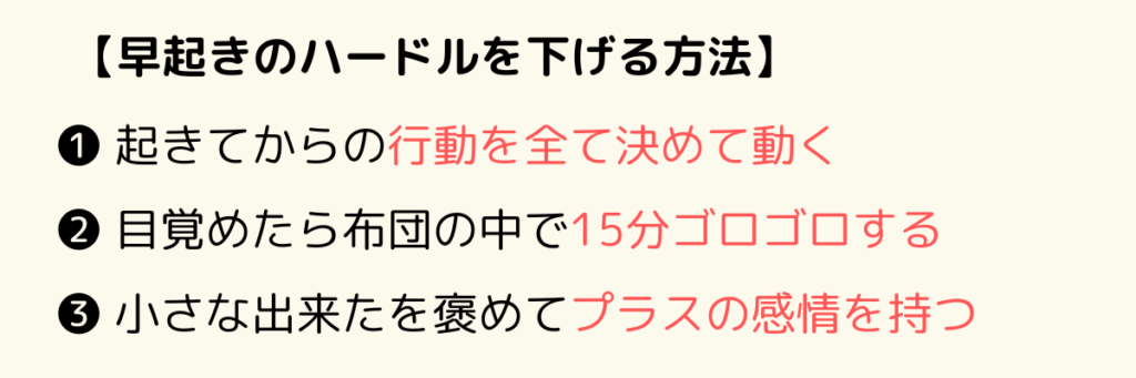 どんな風にハードルを下げることで、早起きできるようになったのか、具体的な方法を紹介していきます。